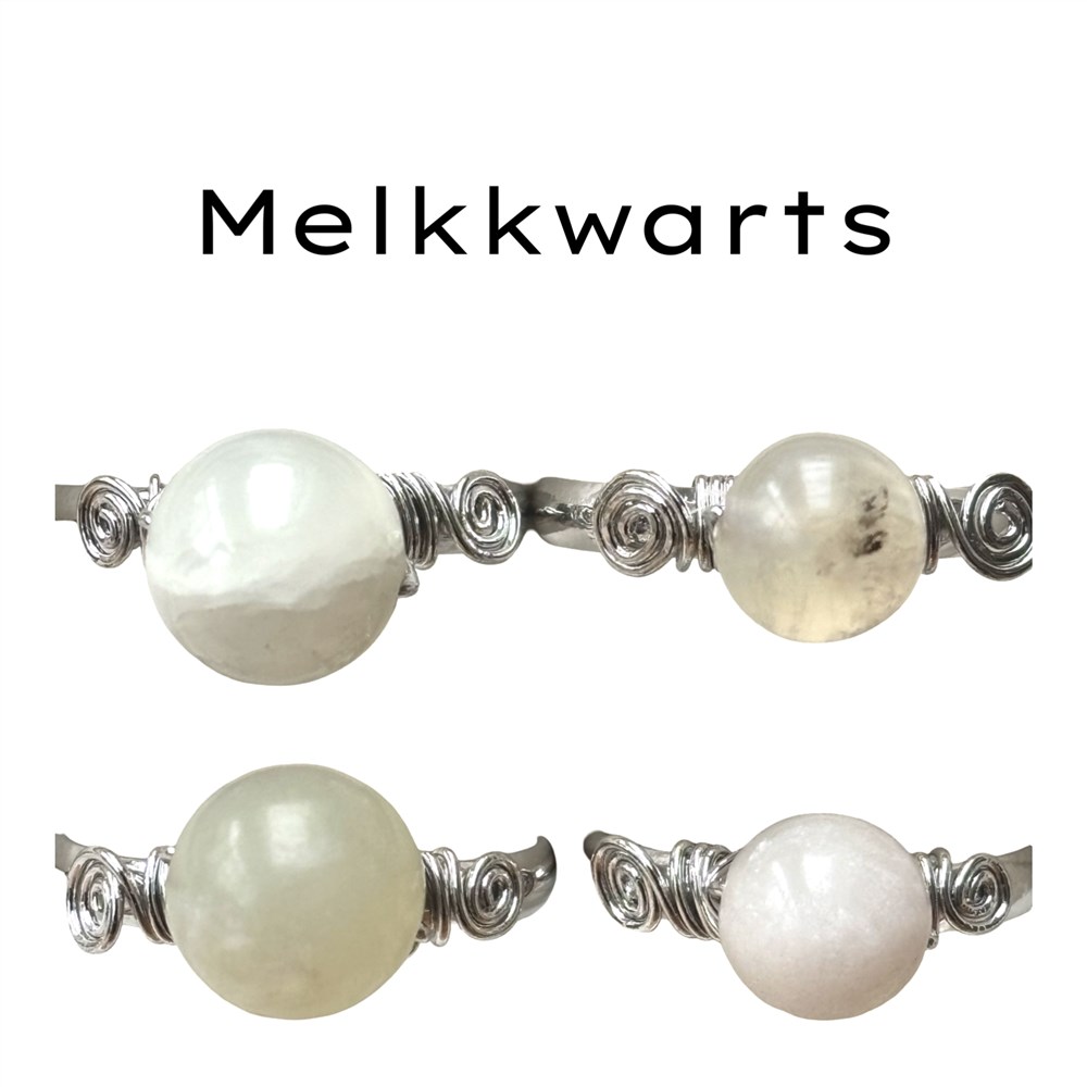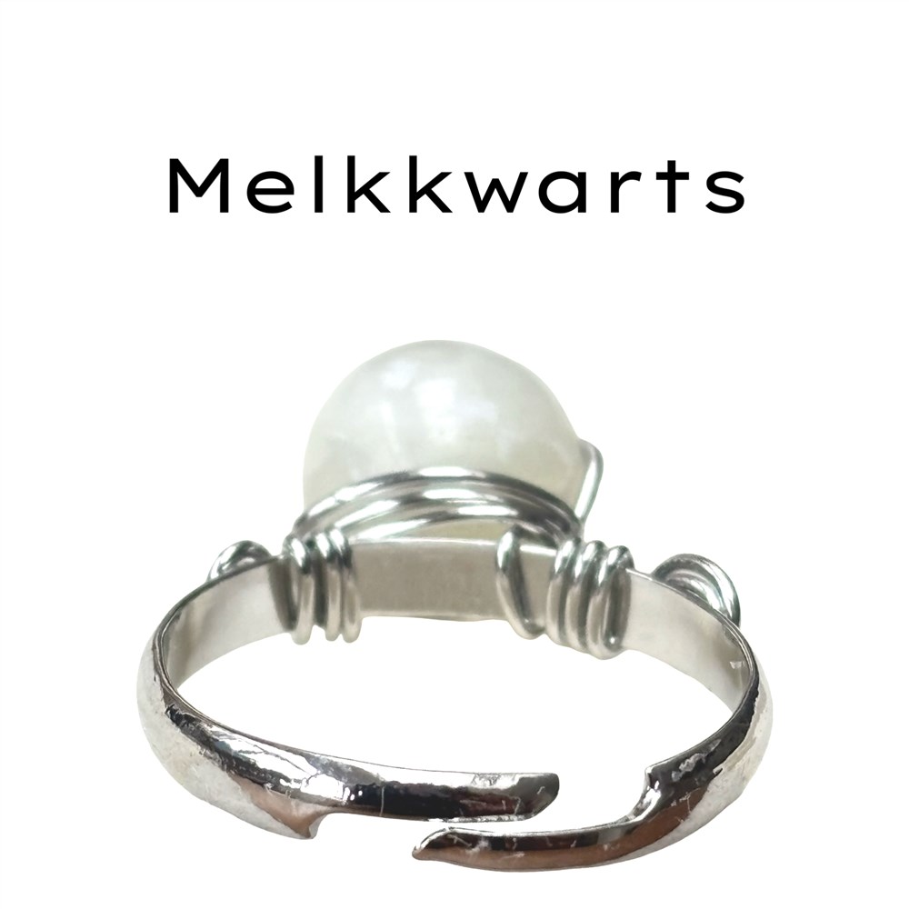 Melkkwarts one-size ring: zachte helderheid en pure rust. Deze elegante melkkwarts ring past altijd dankzij de one-size pasvorm. De steen heeft een zachte, melkachtige uitstraling die licht doorlaat en een rustige, serene sfeer oproept. Een subtiel en tijdloos detail dat elke outfit verfijnt. Betekenis van melkkwarts: Melkkwarts staat symbool voor zuiverheid, rust en emotionele helderheid. Het is een steen die helpt om spanning los te laten, je gedachten te kalmeren en meer balans in jezelf te vinden. Ideaal voor wie behoefte heeft aan zachtheid, harmonie en een heldere mindset. Uniek natuurproduct: Elke melkkwartssteen is anders. Kleur, vorm en tekening kunnen variëren. Dat maakt elke ring uniek, net als jij. Kaartje met betekenis: Bij elke ring ontvang je een mooi kaartje met een symbolische tekst die spreekt vanuit de steen. Een kleine, persoonlijke boodschap die de betekenis van melkkwarts extra bijzonder maakt. Perfect als cadeau: Een liefdevol, rustgevend geschenk voor iemand die je iets moois wilt meegeven… of een zacht momentje van self-care voor jezelf natuurlijk.